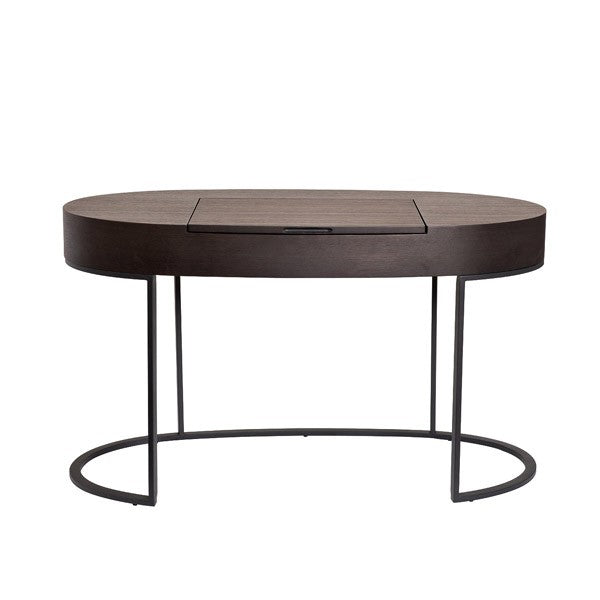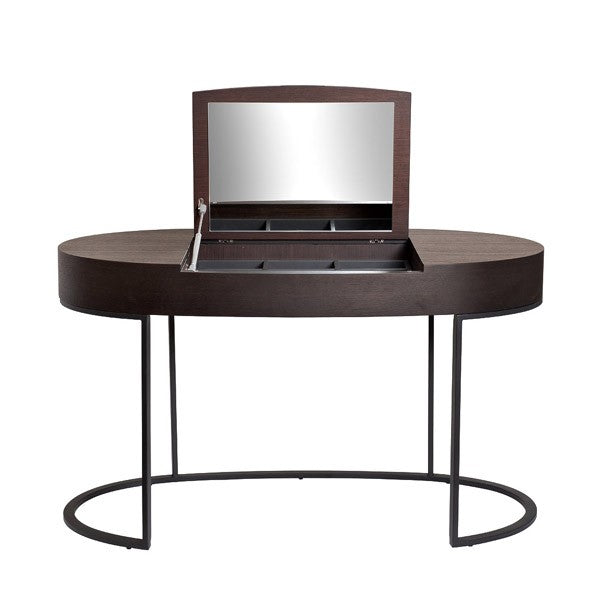 The Verge Vanity epitomizes sophistication and functionality, creating an exquisite centerpiece for any bedroom or dressing area. Its oval shape, adorned with a sleek grey wash veneer finish, exudes elegance and contemporary charm. Supported by black powder-coated legs, the vanity offers stability and a modern touch. The integrated pop-up mirror not only adds a touch of luxury but also provides convenience for flawless beauty routines. With ample storage space featuring different compartments, the Verge Vanity ensures efficient organization of cosmetics, jewelry, and grooming essentials. The unique base design enhances its artistic allure, making it a true statement piece that elevates the room's aesthetic appeal. Impeccably blending style and utility, the Verge Vanity offers an unparalleled experience for grooming and self-care, making it an indispensable addition to any living space.