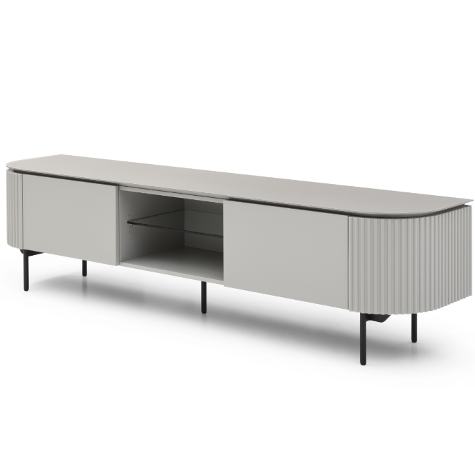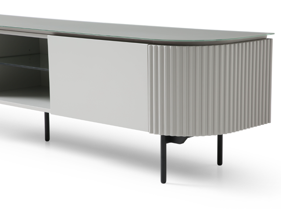 The Lantine TV Unit in light grey lacquer boasts a chic and sleek design that effortlessly complements modern interiors. Its standout feature lies in the ribbed end panels, adding a touch of texture and visual interest. The matte glass top exudes a subtle elegance while providing a sophisticated surface for your entertainment setup. Supported by black powder-coated legs, the unit maintains a contemporary edge. With one middle glass shelf and ample storage, this 2-meter-long unit offers a practical solution for organizing media equipment and accessories. The Lantine TV Unit harmoniously combines style and functionality, becoming a focal point that enhances any living space with its refined aesthetic and thoughtful design.