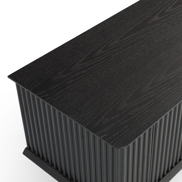 Elevate your modern home with the unparalleled elegance of the Rhodes TV Unit. Crafted to perfection, it embodies a seamless blend of luxury and contemporary design. The smoked oak top and meticulously detailed middle drawer evoke a sense of enduring charm, while the ribbed black sides and doors create a captivating contrast that exudes sophistication. The exquisite brushed brass handles and delicately crafted foot caps add a final touch of opulence, infusing the piece with a sense of refined grandeur. As both a functional and artistic centrepiece, the Rhodes TV Unit makes an unequivocal statement, harmoniously merging classic appeal with contemporary aesthetics to enhance your living space in an unforgettable way.