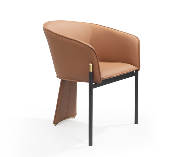 The Felipo Dining Chair is a true embodiment of unique design, making a striking statement in any dining setting. Its intriguing form, supported by three distinctive legs, immediately captures attention and sparks curiosity. The tan faux leather upholstery not only adds a touch of luxury but also offers comfort during meals. The black powder-coated frame provides a sleek and modern contrast, while the gold capping detailing adds a subtle yet opulent touch to the chair's overall aesthetic. The Felipo Dining Chair is more than just a seat; it's a conversation starter and a work of art that seamlessly combines form and function, making it an ideal choice for those who appreciate innovative design and a touch of glamour in their dining space.