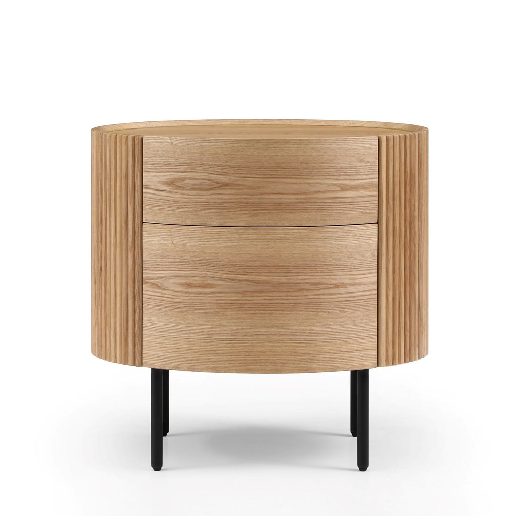 Elevate your bedroom's allure with the Lantine Bedside Table in Ash Oak—an embodiment of timeless elegance and refined style that seamlessly integrates into your space. Boasting two meticulously crafted drawers and a top and doors finished in the rich, inviting hue of ash oak, this bedside table offers a practical haven for your bedtime essentials. The ribbed end panels and sleek black legs are thoughtful details that accentuate its exquisite craftsmanship. This versatile piece transcends mere functionality, transforming any room with its sleek, contemporary design that echoes modern sensibilities. Its ample storage capacity meets your organizational needs while its minimalistic aesthetics add a touch of understated sophistication. As the Lantine Bedside Table graces your bedroom, it not only serves as a practical companion but also becomes a visual statement—a true testament to your discerning taste and appreciation for design that beautifully marries form and function.