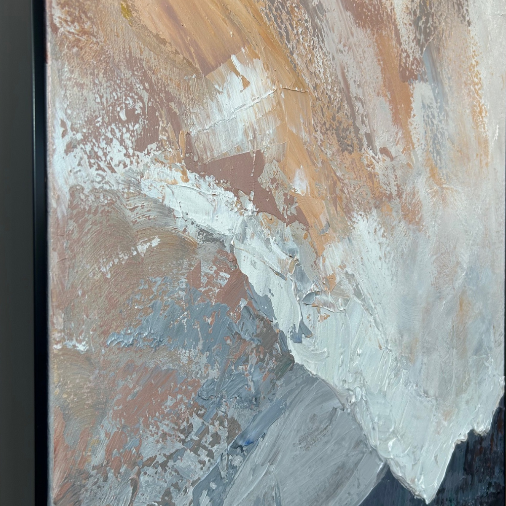 "Winter Morning" is an evocative oil painting that captures the serene essence of a frosty dawn with its abstract interpretation and rich texture. The artwork features a harmonious blend of muted hues and layered brushstrokes, creating a sense of depth and movement that mirrors the quiet beauty of a winter landscape. Framed in a sleek black frame, "Winter Morning" highlights its intricate textures and subtle tonal variations, adding a touch of modern sophistication to any space while evoking the tranquil ambiance of a crisp, early morning.