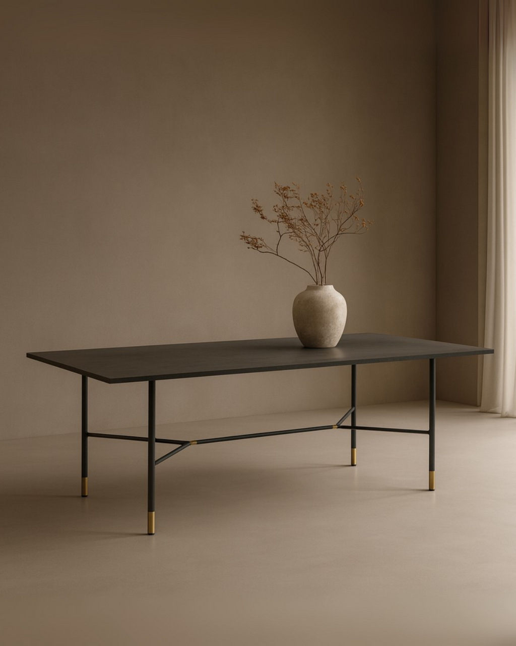 The Bofo Dining Table exudes modern elegance and contemporary sophistication, making it a striking centerpiece for any dining space. Its matte black oak veneer top offers a refined, luxurious finish, while the black legs with brass sleeve detailing add subtle visual interest and a touch of opulence. The table’s sleek silhouette combines style and functionality, providing a generous surface for meals and gatherings. Ideal for both intimate dinners and formal entertaining, the Bofo Dining Table brings timeless charm and refined aesthetics to any interior.