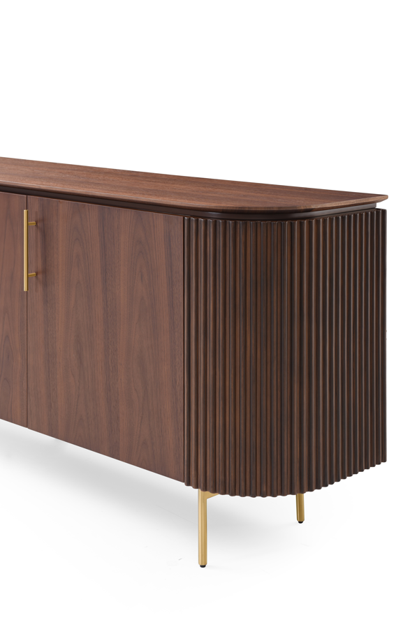 Add a touch of luxury to your home with the Lantine Buffet. Crafted from rich walnut and accented with elegant brass legs and handles, this contemporary piece exudes refined sophistication. The ribbed detailing on either end enhances its striking design, making it a standout addition to any dining or living area.
