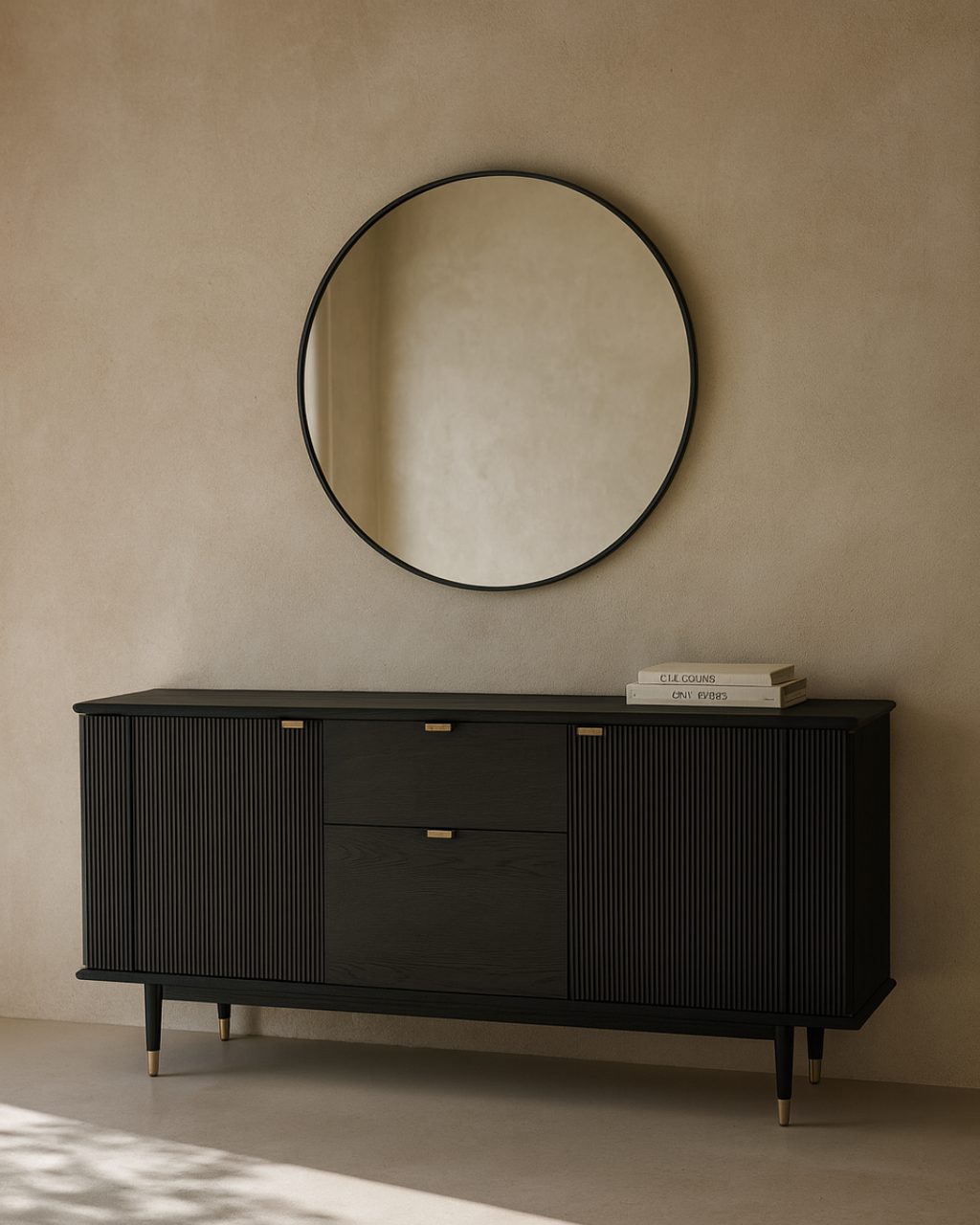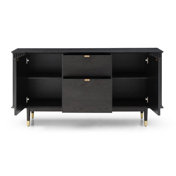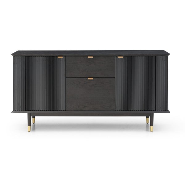 The Rhodes Buffet is a stylish and modern storage solution, perfect for any home. Crafted from high-quality smoked oak veneer, the buffet features ribbed sides and two full-height cupboards, with doors finished in a classic matt black color. Polished brushed brass handles and leg cap detailing add the perfect touch of elegance. Inside, two large drawers offer plenty of storage space, ensuring you have enough room for all your essentials. Whether it's in the dining room, living room, or bedroom, the Rhodes Buffet will bring effortless sophistication to your home.