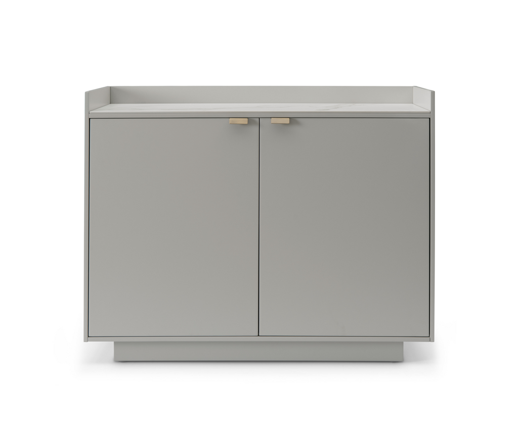 Elevate your space with the refined simplicity of the Saviour 2-Door Cabinet in a warm matte beige finish. Designed with a contemporary yet timeless appeal, this piece features a striking Calacatta-look top, adding a touch of luxury to any setting.