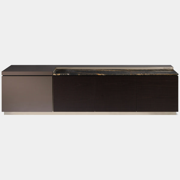 Visionnaire Barbican Low Unit: Modern luxury low unit featuring a Port Laurent marble top, textured canneté motif doors, and sleek gold metal details.